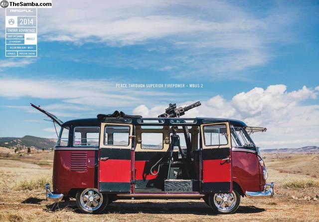 This 1962 Volkswagen type 2 microbus, affectionately known as Magpul's "MBUS2," was acquired by the company in 2011 and gained significant attention when it was showcased at the SHOT Show in 2013. The exterior is finished in a striking maroon and black two-tone paint scheme and inside is fitted with black seating and Magpul-branded accents. The bus is powered by a rebuilt 1.6 liter completed in 2025 mated to a 4-speed manual transmission. Options include 15" Fuchs-style chrome wheels, safari windows front and rear, sun roof, air ride suspension, jail bars in the cargo area, and a modern sound system. The dash is signed by Robert E. Gackenbach, a second lieutenant and navigator who served as a photographer on the Hiroshima atomic bomb mission. This custom vehicle was a standout feature at Magpul's booth, blending vintage automotive design with modern tactical flair. After disappearing from the spot light it was acquired by the seller in 2023 and brought back to life with the replacement of the gas tank, fuel sender, fuel gauge, and fresh 1600 engine.