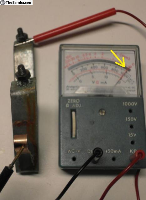Left & right factory tail light brackets: 111-945-291 and 111-945-292. The copper spring contacts were cleaned to bright condition for perfect connection to bulb sockets. Conductivity from the contacts to the brackets thru the rivets was verified as perfect (photo with ohm meter)