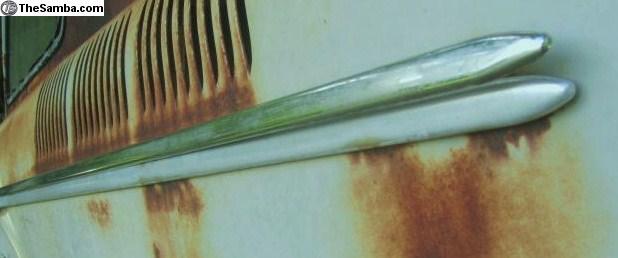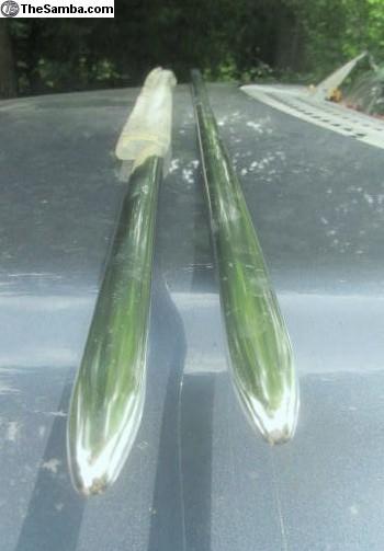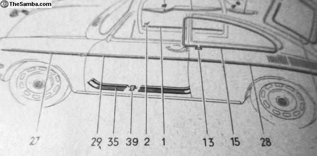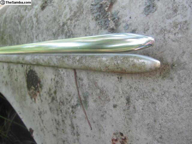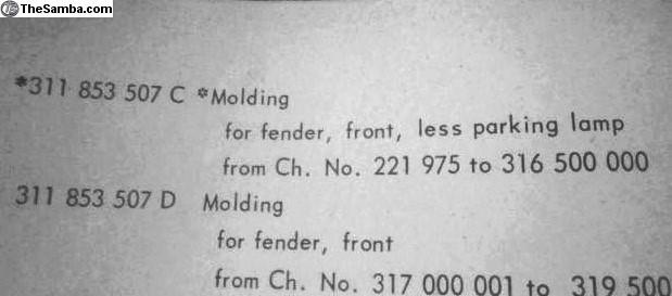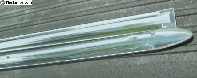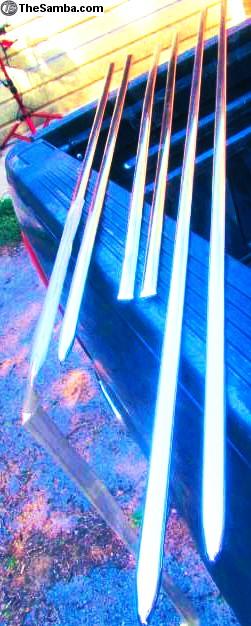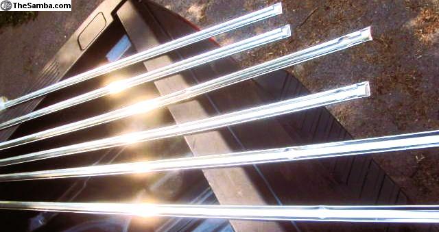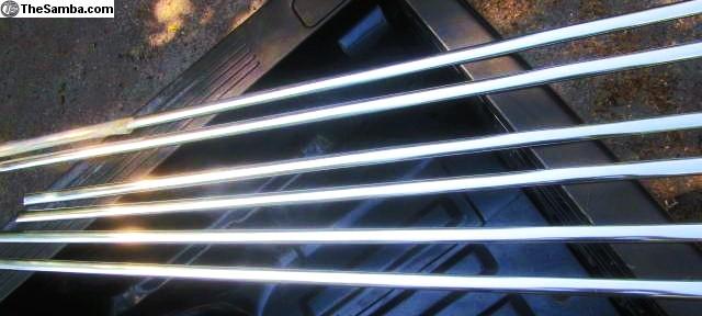 Genuine German Volkswagen. NewOldStock: Believe to be: Six (6) bright and shiny NOS aluminum Body moldings for 1964-1966. Two (2) Part Numbers 311 853 507 C fender Front Moldings/spears (Without Side Parking Light). Two (2) Part Numbers 311 853 515 B Door Moldings. Two (2) Part Numbers 311 853 509 A rear Long Moldings/spears for Quarter Panels. This Parts set denoted in Parts Book as being for USA and certain export markets-front Moldings/spears not for European (not for vehicles with side markers/parking lights). Applicable from Chassis Numbers 221 975 to 316 500 000 (August 1963 through July 1966 Model Years 1964-1966 for Models 311-314 and 361-364! Left or Right attachment! Images posted with a "dead" wagon comparing the NOS pieces to the Old/Used ones. One partial Parts Tag attached on one piece. Complete sets of NOS Moldings remain quite shy, hardly ever gathering in public-especially at VW shows!! Genuine NOS VW parts From the mother country Germany-not repos, not Communist, not stainless which isn't original!! These have been moved about the last perhaps 50 plus years-some scratches and abrasions, not many, one dimple, and as those familiar with chrome pieces are aware, especially long ones minor twinges, normally smooths out when attached with the fasteners. No other pieces only the listed Six! Numbers 27, 28, and 29 refer in Illustrated Parts List. Ensure Application! $240MailedLower48. Zelle, USPSMO, PayPal.
