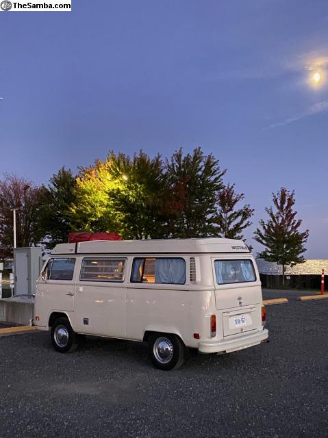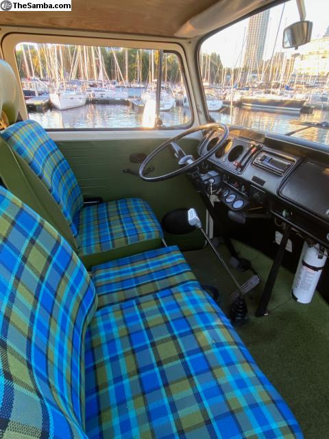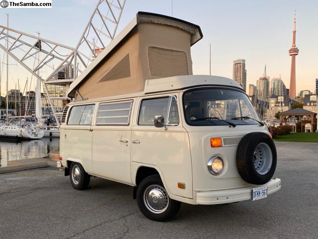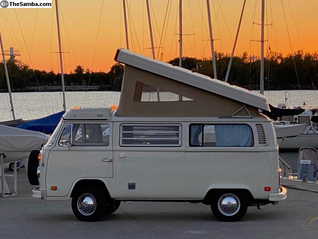 This "Campmobile 70" model has been meticulous maintained by the Toronto VW Bus experts germansupply.com since her current owner originally purchased in 2003. Bus is in pristine drive-away condition. Professionally rebuilt (Scott of germansupply.com, 2021) and mildly upgraded 2.0l air-cooled engine (1974 models came originally with a 1.8l engine). Many tasteful and functional upgrades including German-made 3-point retractable front seat belts, high quality older Alpine stereo and high end speakers. Interior is completely original with the exception of the stock Westfalia fridge/sink cabinet having been removed for a more open interior layout. Exceptional quality paint work (2014) by VW specialist Volker of Body By Crome in Newtonville, ON. Never been winter driven and always stored inside over the cold months. Absolutely zero underbody rust. Doors open and close like a new vehicle. Engine runs beautifully. New Continental Vanco 185R14C tires (2025). Ready to use immediately, this is not a project, it's an honest "needs nothing" vehicle, a rarity with something that is over "50 years new".