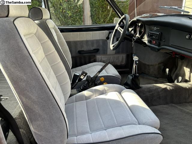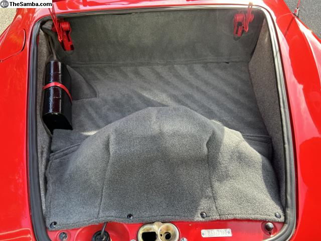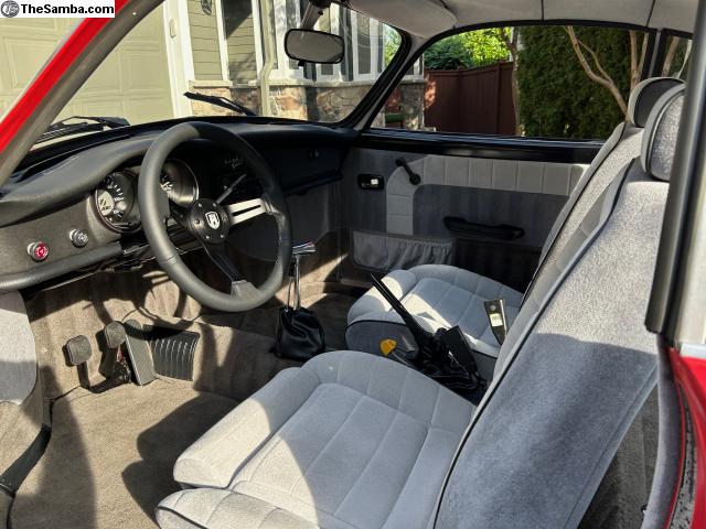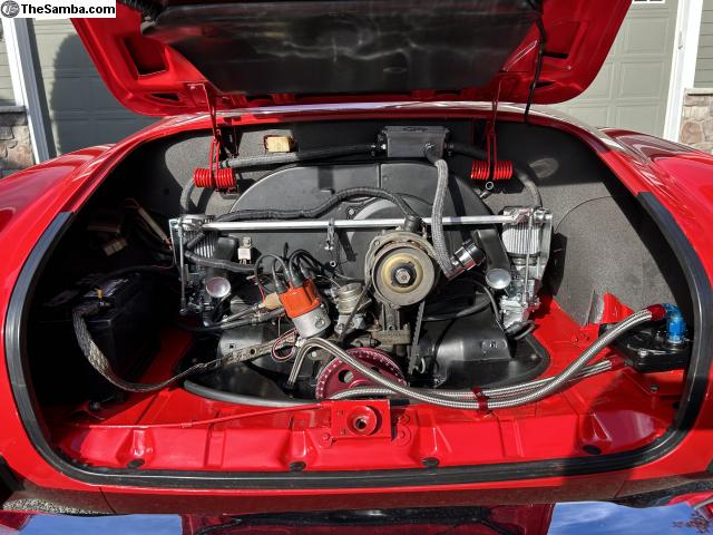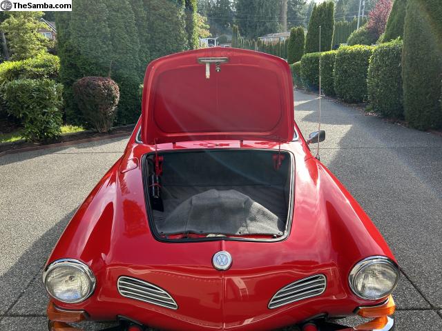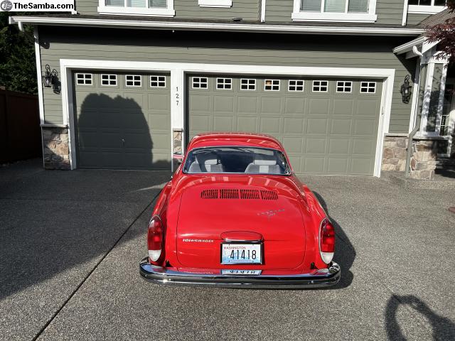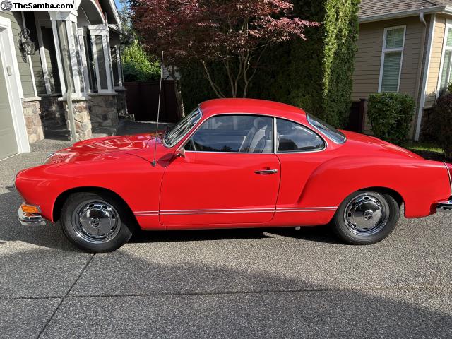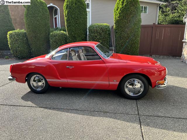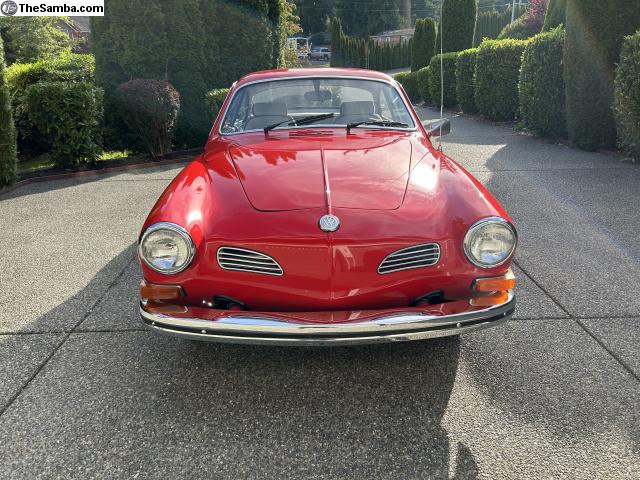 This 1974 Volkswagen Karmann Ghia coupe was refinished in red before the seller's acquisition in 2021, and the air-cooled 1.6L flat-four was subsequently modified with dual carburetors, an electronic ignition system, and an EMPI exhaust system. Power is directed through a four-speed manual transaxle with a Scat shifter, and the car rides on 15" steel wheels with hubcaps. The cabin was fitted with replacement bucket seats trimmed in gray cloth as well as a Panasonic CD stereo and an aftermarket steering wheel. This Karmann Ghia coupe is now offered with removed spare parts and a Washington state title in the seller's name.