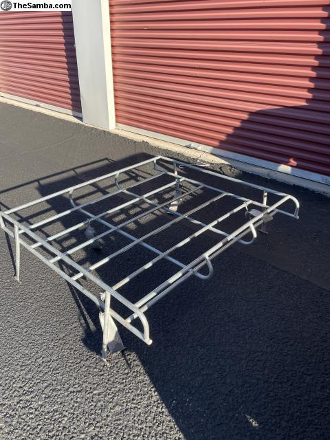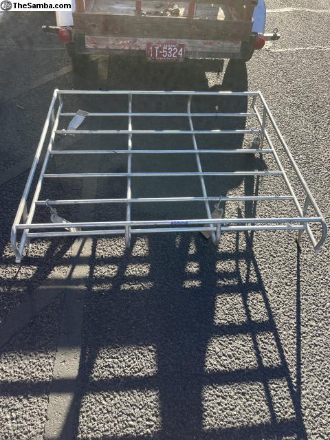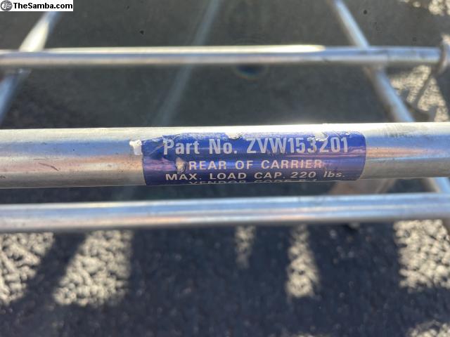 Original Volkswagen roof rack. It still has the Volkswagen parts number sticker. Please look at pictures. 4' (four foot) length. Has all four clamps, rack is in good condition. It fits split or bay window bus.