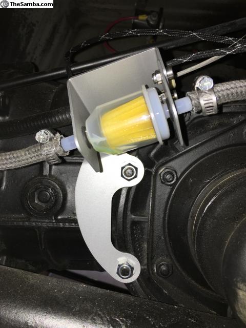 Do not install your fuel filter above your engine. This bracket allows you to mount it down by the transaxle in a much more secure place. This is a much cleaner looking and safer location. Mounting bracket bolts directly to the transaxle and places the filter inline with the fuel line. Fits both swing arm and IRS. Just splice it in as shown in the pictures. The filter is easily changed when necessary. Hardware in bracket is stainless steel with rubber grommets. Bracket comes with a filter installed.
