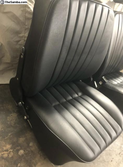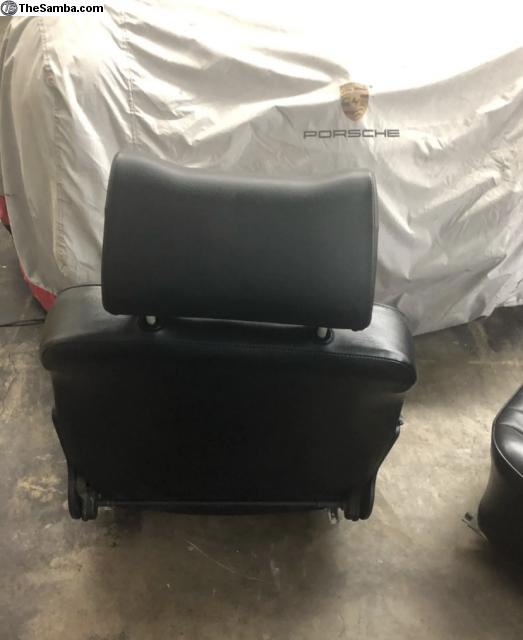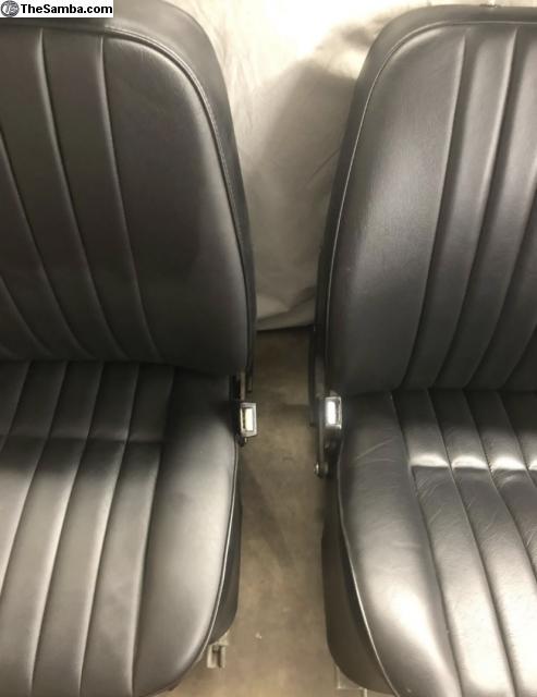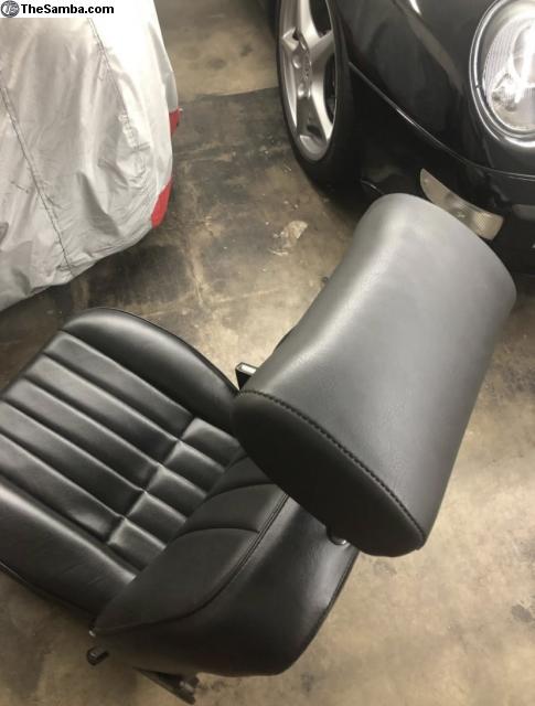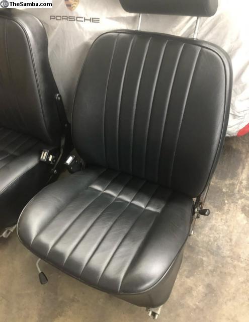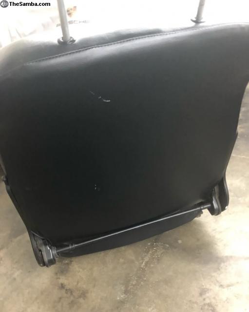Nice set of ‘69-71 911/912 Factory Comfort seats in Black Vinyl. In great overall condition without no signs of wear. Plating looks in very good condition, vinyl shows one light 3" tear and one 1 inch tear at bottom of drivers side seat. Seats are straight, as are headrests. Rails included. $2000