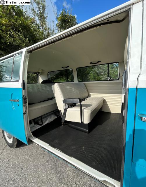 Inside, the bus has a clean and bright interior with new front seat upholstery in smooth off-white vinyl (7 seats), new flooring, new door panels, sun visors, glove box, trim pieces, mirrors, and more. Most parts came from JBugs and BusDepot.