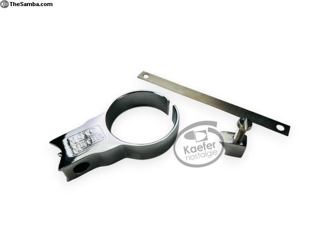 We are now making an exact reproduction of this very nice looking gauge holder Motometer. Made from the same pot-metal material as the original our gauge holders feature triple chrome plating (copper, nickel and chrome) or excellent quality paint for that perfect finish. Straps are correct thickness stainless steel. Black, chrome and ivory version available. Die-casting process to get a perfect replica. Chromed bolt and nut are also included. Fits all Beetles.