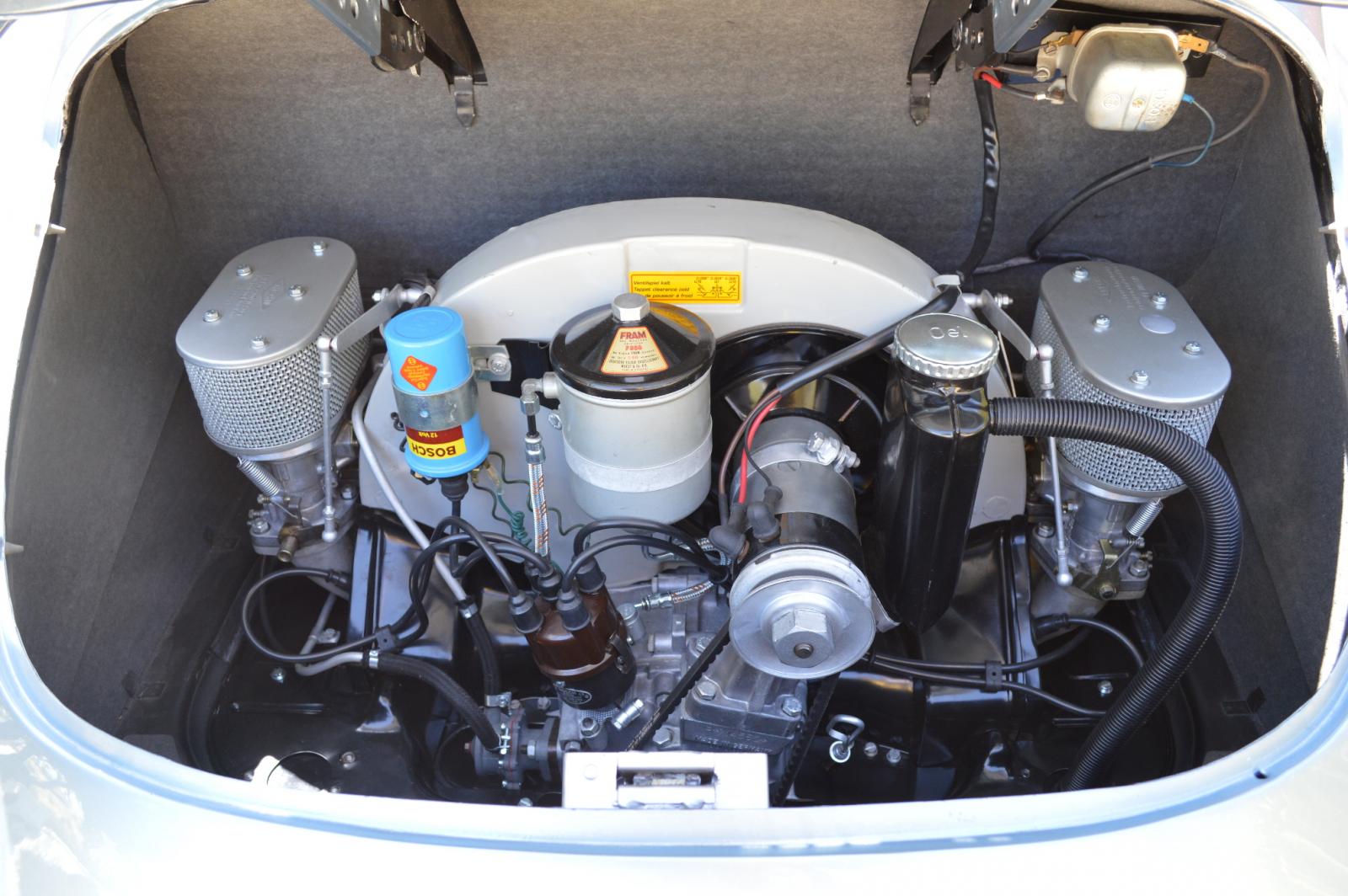 The engine is a freshly built 356C unit #P-714560 using Willhoit Restorations 91mm Durabar cylinders and custom pistons bringing displacement to 1925cc. The latest version of the WR heads and WR 41/36 valve kit, a WR 78-8 cam were also used. The distributor and the Weber 40 IDF carbs have been completely rebuilt as well. 911 style oil squirters and a high capacity aluminum oil cooler were installed to provide better oiling and cooling.