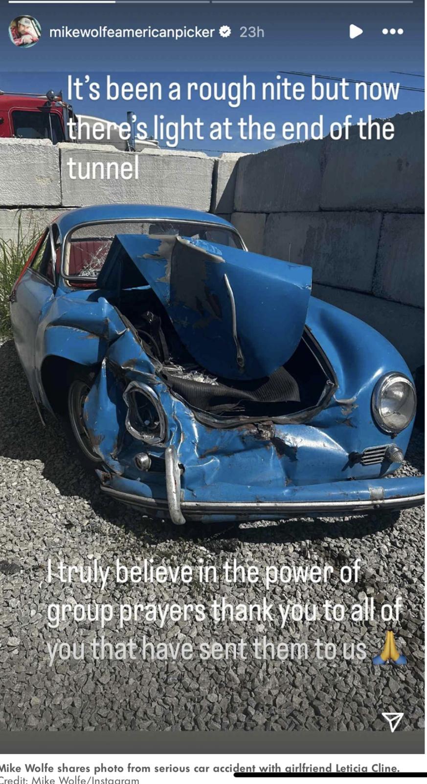 Mike Wolfe’s wrecked Blue Porsche 356 A Coupe.. Him and Girlfriend hospitalized.